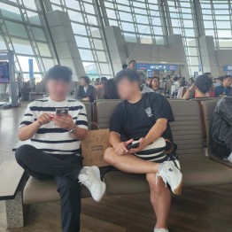 2명 맞선 여행 출국장 입니다.신랑이 얼굴노출을 원하지 않아 모자이크처리 했습니다.